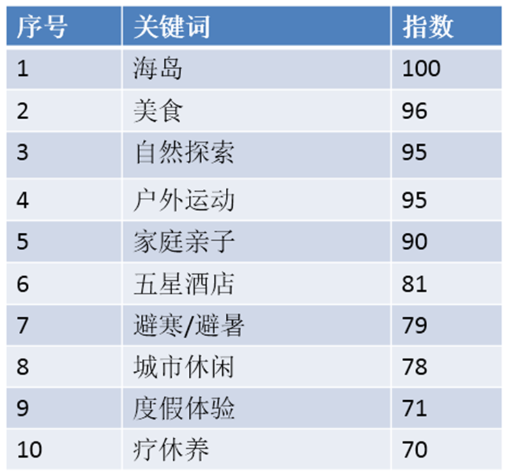 根据网上数以亿计的海量搜索关键词,报告发布了2017年出境休闲旅游十大主题关键词和指数:包括海岛(100)、美食(96)、自然探索(95)、户外运动(95)、家庭亲子(90)、五星酒店(81)、避寒避暑(79)、城市休闲(78)、深度体验(71)、疗休养(70)。