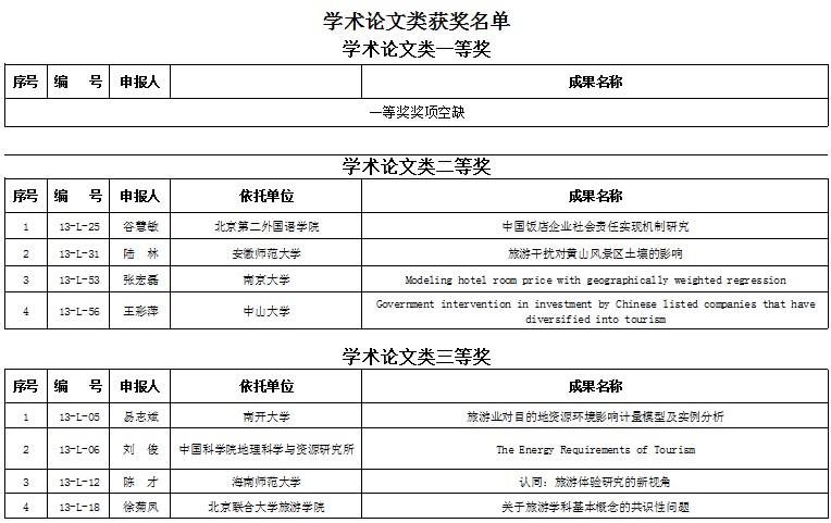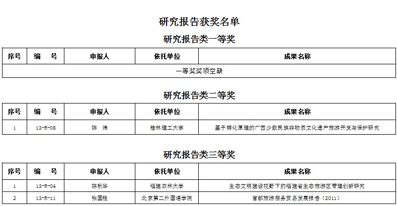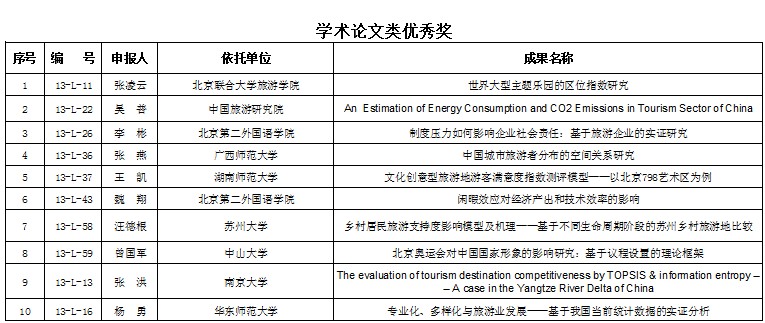 2013年国家旅游局优秀旅游学术成果奖获奖名单