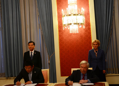 3月21日,在中国国家副总理汪洋、俄罗斯副总理戈洛杰茨的共同见证下,我院戴斌院长、圣彼得堡国立经济大学卡尔·马克副校长分别作为中方和俄方代表,在俄罗斯联邦政府大楼签署了《中国旅游研究院、黑龙江大学与圣彼得堡国立经济大学关于旅游科研、教育与国际交流的三方合作协议》。