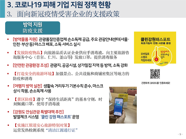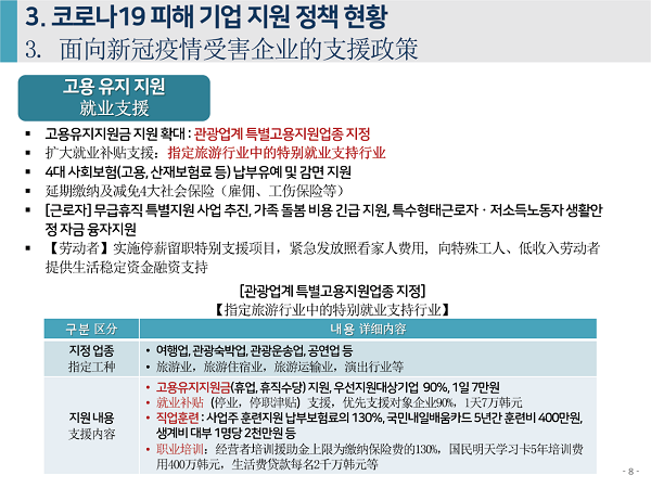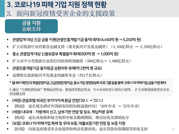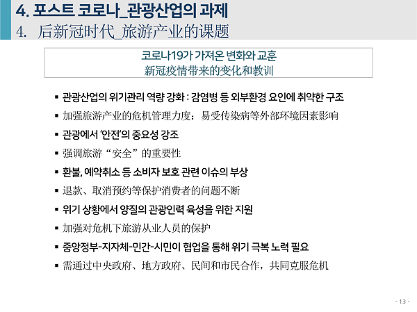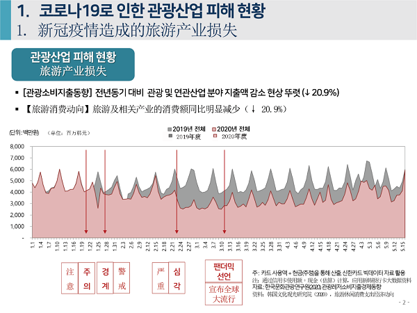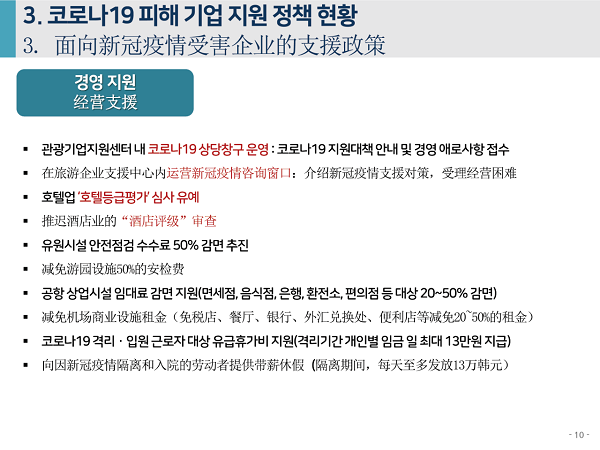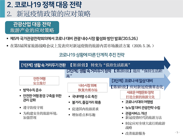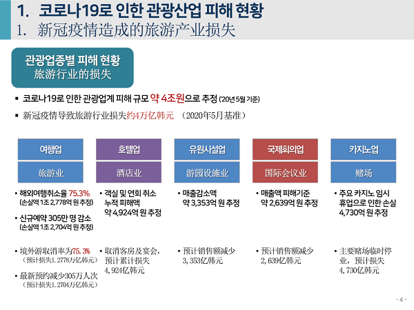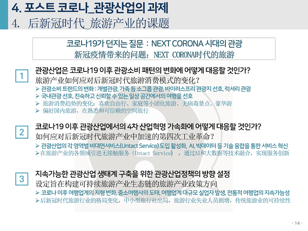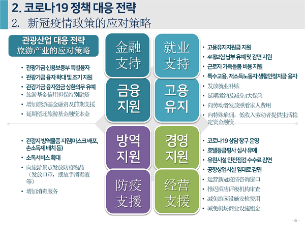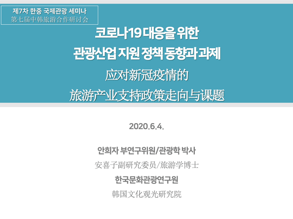 2020年6月4日下午,由中国旅游研究院、韩国文化观光研究院联合主办的“第七届中韩旅游合作研讨会”在线举办。中、韩两研究院院长率各自团队,和来自两国旅游业代表、媒体记者参会。韩国文化观光研究院副研究委员安喜子做主题发言,题为“应对新冠疫情的旅游产业支持政策走向与课题”。