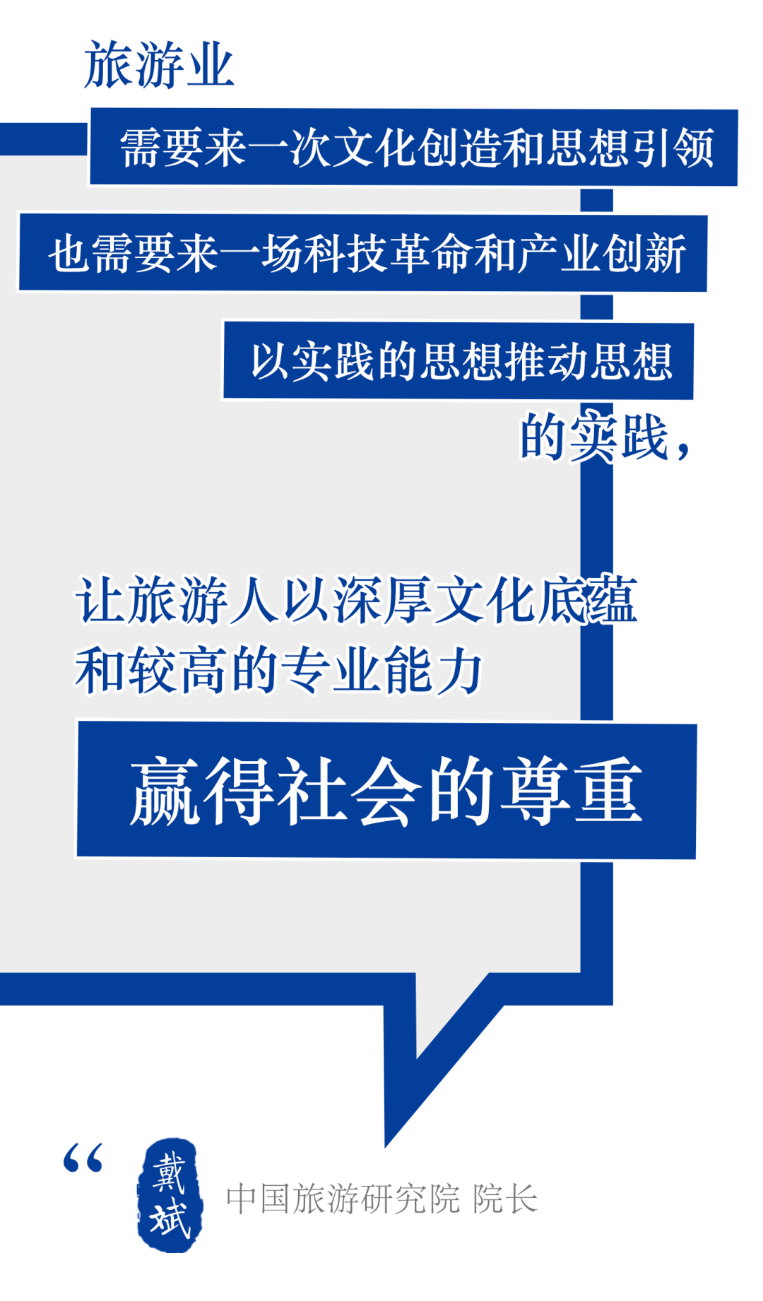 习近平总书记指出:“文化自信是一个国家、一个民族发展中最基本、最深沉、最持久的力量。向上向善的文化是一个国家、一个民族休戚与共、血脉相连的重要纽带。”理想、情怀、价值和意义从来都是驱动旅游事业可持续发展的内生动力,当且仅当旅游人发自内心地认同这一点,旅游业才会实现真正的跃升,旅游人才能自信而从容地站在舞台中央与世界对话。