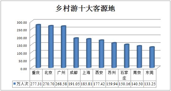 乡村旅游中,跨省跨市出行比重过半,达到了53.75%。乡村游十大客源地中,重庆、北京、广州、成都四大城市出行规模占据半壁江山。
