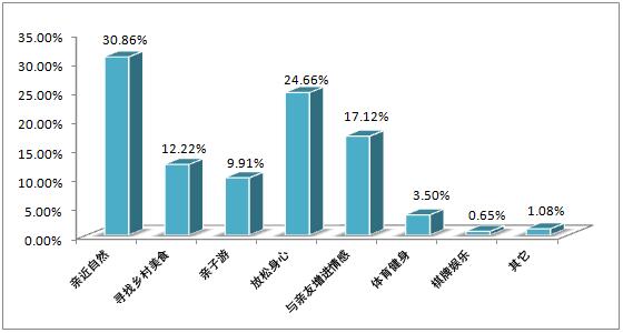 乡村旅游动机调查中, 亲近自然、放松身心和与亲友增进情感分别占比30.85%、24.66%和17.12%,合计约为四分之三;亲子游、体验美食、娱乐健身等目的约占四分之一。