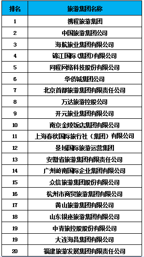 “2016年中国旅游发展论坛”于12月5-7日在广东东莞举行,论坛发布了《2016年中国旅游集团发展报告》,公布“2016年中国旅游集团20强名单”。2016年中国旅游集团20强名单为:携程旅游集团、中国旅游集团公司、海航旅业集团有限公司、锦江国际(集团)有限公司、同程网络科技股份有限公司、华侨城集团公司、北京首都旅游集团有限责任公司、万达旅游控股公司、开元旅业集团有限公司、南京金陵饭店集团有限公司、上海春秋国际旅行社(集团)有限公司、景域国际旅游运营集团、安徽省旅游集团有限责任公司、广州岭南国际企业集团有限公司、众信旅游集团股份有限公司、杭州市商贸旅游集团有限公司、黄山旅游集团有限公司、山东银座旅游集团有限公司、中青旅控股股份有限公司、大连海昌集团有限公司、福建旅游发展集团有限责任公司。