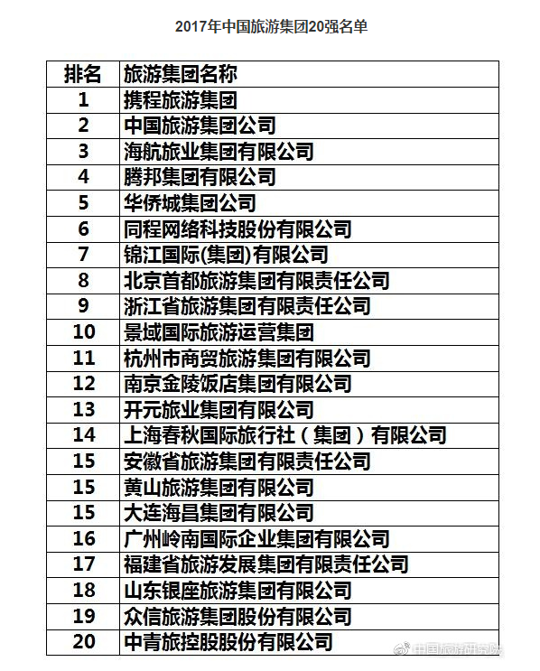 2017年12月20日中国旅游研究院、国家旅游局数据中心和中国旅游协会在苏州发布了以“内容创造与生活引领”的旅游集团年度发展报告,正式公布了“2017年中国旅游集团20强”:他们是:携程旅游集团、中国旅游集团公司、海航旅业集团有限公司、腾邦集团有限公司、华侨城集团公司、同程网络科技股份有限公司、锦江国际(集团)有限公司、北京首都旅游集团有限责任公司、浙江省旅游集团有限责任公司、景域国际旅游运营集团、杭州市商贸旅游集团有限公司、南京金陵饭店集团有限公司、开元旅业集团有限公司、上海春秋国际旅行社(集团)有限公司、安徽省旅游集团有限责任公司、黄山旅游集团有限公司、大连海昌集团有限公司、广州岭南国际企业集团有限公司、福建省旅游发展集团有限责任公司、山东银座旅游集团有限公司、众信旅游集团股份有限公司、中青旅控股股份有限公司。