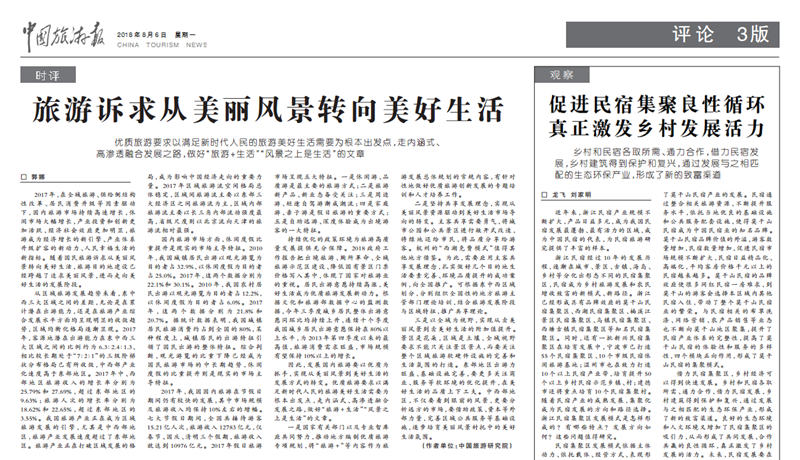 优质旅游要求以满足新时代人民的旅游美好生活需要为根本出发点,走内涵式、高渗透融合发展之路,做好“旅游+生活”“风景之上是生活”的文章。受中国旅游报邀请,我院国际所郭娜博士撰写《旅游诉求从美丽风景转向美好生活》评论文章,刊登于8月6日《中国旅游报》第3版。全文如下:
