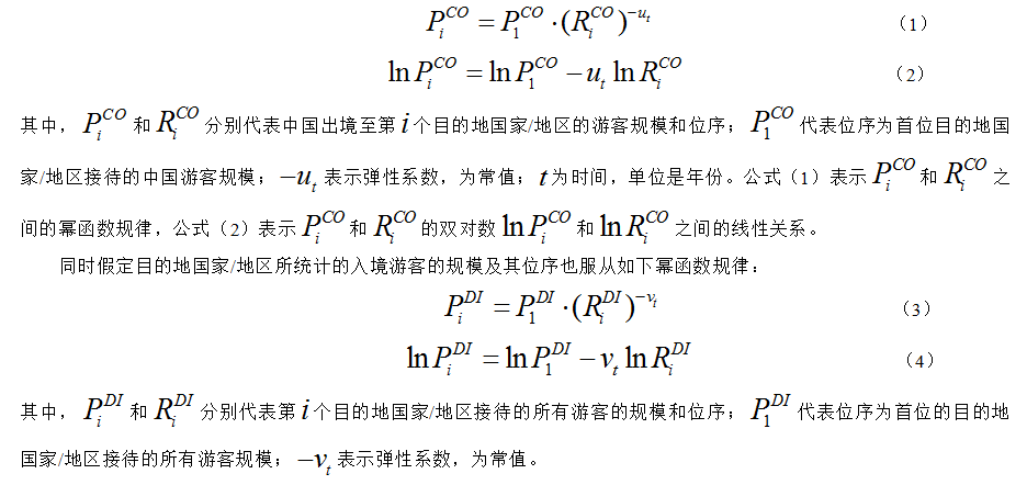 位序规模法则首先由德国学者Auerbach于1913年在研究5个欧洲国家和美国城市人口规模分布规律时提出,指一个城市的规模和该城市在国家所有城市按人口规模排序中的位序关系所存在的规律。其中,最著名的Zipf定律最初表征一个城市的规模与其位序的乘积等于首位城市的规模[19]。更为一般化的Lotka模式在位序变量上增加了一个幂指数作为弹性系数,从而增强了位序规模法的普适性。本文假设中国出境至目的地国家/地区的游客规模和及其位序服从如下的幂函数规律: