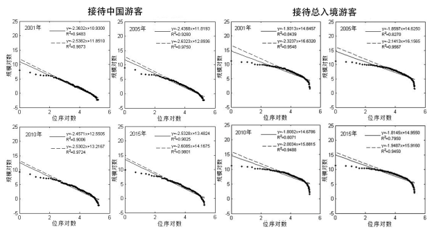 在判断目的地接待中国游客规模、入境游客总规模是否满足位序规模法则的过程中,需要将游客规模按从小到大排序,将规模序号和游客规模数据绘在双对数坐标图上,并观察其拟合态势。如果两者存在回归拟合函数关系,则表明目的地接待游客规模符合位序规模分布。其中,可以由对数方程中的斜率即幂函数方程中的指数引申出其地理意义[20]。若其绝对值大于1,则高位序目的地发育更加突出,反之则低位序目的地发育更加突出;若其绝对值变化大,则影响规模分布的集聚作用大于分散作用 [19]。