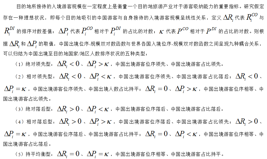 此外可以引申,对于某一个目的地,中国出境游客的绝对领先、相对领先、绝对落后、相对落后和持平均衡,分别意味着除中国之外入境游客绝对落后、相对落后、绝对领先、相对领先和持平均衡的依次对应关系。
