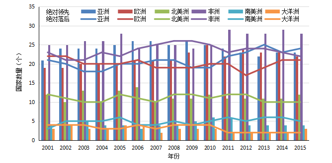 虽然非洲大部分国家接待中国出境游客处于领先地位,但游客规模较大的埃及一直处于落后水平,南非也在2006-2014较长的时间段内属于绝对落后型目的地。因此,虽然中国出境旅游在非洲多数国家保持领先,但规模总量却相对滞后。2001年,中国出境埃及和南非两个目的地的游客位序分别为33位和40位,同期两国接待总入境游客位序分别为17位和33位。2015年,两国接待总入境游客位序分别为34位和36位,而中国出境游客位序分别为48和35位,南非接待中国游客呈现领先但差距微弱,尚不稳定。相较于非洲各国,中国出境旅游在大洋洲旅游市场的领先优势明显。2001和2015年,澳大利亚总入境游客位序分别为36位和40位,但接待中国游客位序高居15位;新西兰总入境游客位序分别为55位和61位,但接待中国游客位序高居24位和27位。