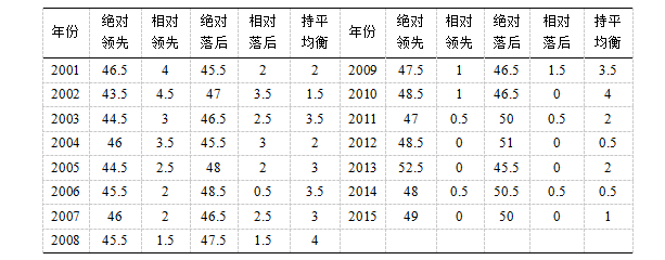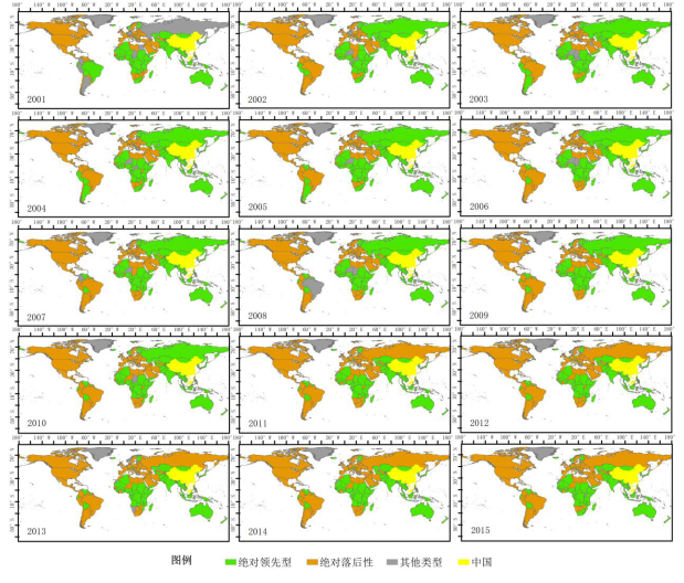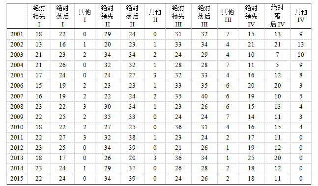 (2)从2001年到2015年,耦合关系中绝对领先与绝对落后型的目的地比重均超过45%。亚太国家接待中国游客普遍处于领先地位,但欧美和中东国家接待中国游客大多处于落后地位。游客总规模较大的目的地中,绝对落后型数量大于绝对领先型,而游客总规模较小的目的地绝对领先型数量大于绝对落后型。