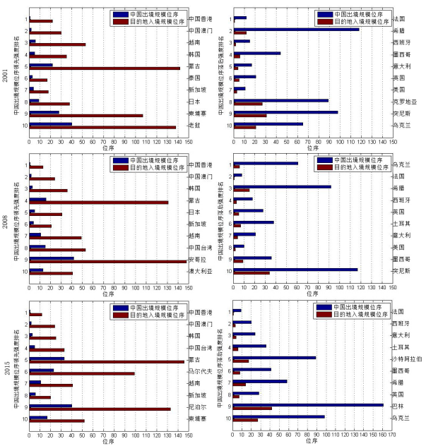 本文根据位序规模分布的理论,作出中国出境游客符合位序规模分布规律的假设,以2001-2015年中国出境游客与目的地入境游客规模数据为基础,认识中国出境游客在世界各国与地区的空间分布规律,并分析与验证各目的地接待中国游客的位序规模分布规律及其入境游客规模间的耦合关系。研究结果表明: