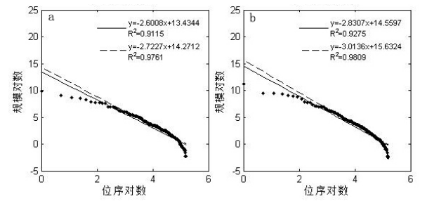 Fig 5 Fitting double logarithmic scatter of the size distribution of the Chinese (a) inbound tourists to the destinations compared with the (b) total consumption in 2015