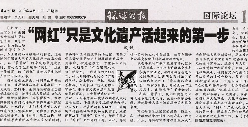 戴斌院长应邀撰写题为:《“网红”只是文化遗产活起来的第一步》一文,刊登在《环球时报》4月11日国际论坛版块。全文转载如下: