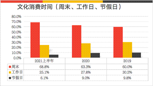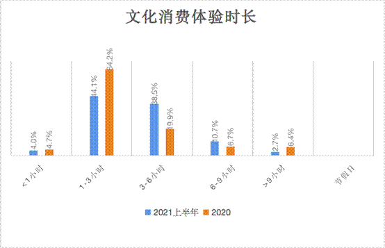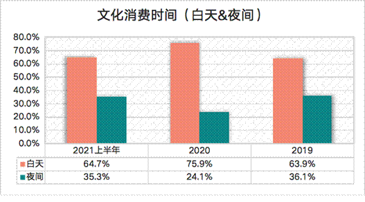 文化消费时长有效延展,周末、夜间消费明显增长。2021年上半年,城乡居民文化深度体验需求增加,消费时间不断延长。相比2020年,2021年上半年文化消费时长在3-6小时的比重增加18.6个百分点,6-9小时的比重增加了4个百分点。从文化消费时段来看,节假日文化消费的比重相对减少,周末比重有所增加,侧面反映出城乡居民文化消费的日常化趋势。2021年上半年夜间文化消费比重占比35.3%,接近2019年平均水平。