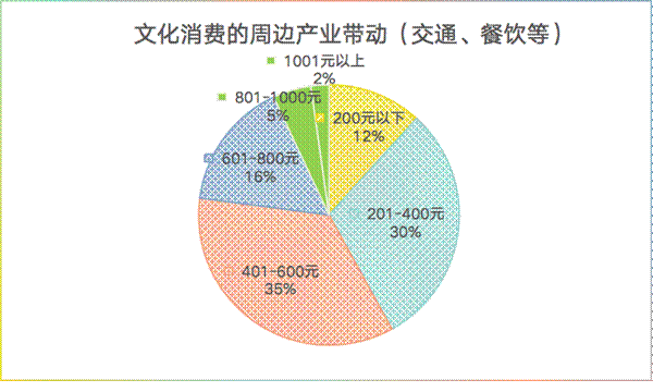 文化消费水平相对平稳,产业带动呈倍增趋势。2021年上半年,城乡居民单次人均文化消费主要集中在200元以下、201-400元区间。相比2020年,200元以下人均消费(38.6%)的比重相对缩减,201-400元(31.5%)、401-600元(18.7%)的比重增加,考虑到人力、物价等综合变动,人均文化消费水平相对平稳。文化消费对交通、餐饮、商业等周边产业带动发挥积极作用,专项调研数据显示,周边产业消费主要集中在201-400元(30%)、401-600元(35%)。