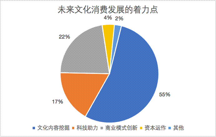 内容创造、科技赋能、模式创新是重要支撑。对于未来文化消费的着力点,55%的企业表示重在文化内容挖掘,文化内涵的挖掘是提升文化消费品质,推进中华文化传承的基础,是消费主体的核心诉求,也是供给主体的发力重点。22%的企业关注商业模式创新,K11购物艺术中心、SKP体验式购物中心等“艺术+商业+体验”商业综合体有效拉动体验式消费,文和友将80、90年代的市井文化带入现代都市打造消费爆款,产品、服务、业态等创新成为文化消费推广的重要抓手。17%的企业认为科技将为文化消费发展提供支撑,科技在打造沉浸式场景、提高搜索和预订效率、即时传播与分享方面发挥积极贡献,科技支撑行业发展已成为行业共识。