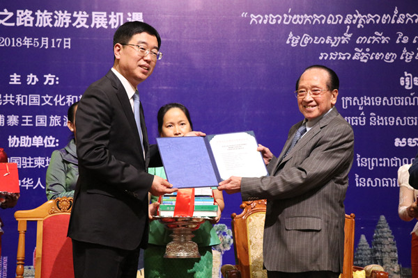 5月17日下午,中国文化和旅游部与柬埔寨旅游部共成功举办了“2018中国-柬埔寨旅游合作论坛”。开幕式上,中国代表团团长、文化和旅游部党组成员杜江向柬埔寨王国政府贺南洪副首相致赠了中国旅游研究院编制的规划成果《暹粒省旅游开发规划》。