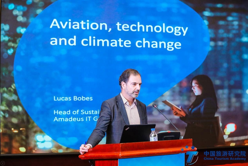 西班牙Amadeus集团负责人 Lucas Bobes先生介绍了关于旅行技术在降低碳排放上的应用实践与未来可能路径。