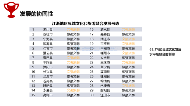 县域文旅融合存在旅强文弱的普遍性特征。文旅融合的过程既是“创业”,是夯实物质基础;又是“塑形”,是共建精神家园。结合县域文化和旅游协同发展指数的数据分析,浙江县城文旅协同发展平均得分79.477分,江苏省平均得分79.754,前10个县城中,浙江和江苏各5个。在30个样本县城中,近2/3的县城属于旅强文弱类型,也就是说63.3%的县域,文旅融合受到了文化发展水平的制约。强旅游驱动力特征,侧面表征了更加深刻而广泛的文化挖掘亟须注入县域文旅发展进程中。