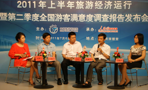 2011年7月6日,由中国旅游研究院主办、人民网旅游频道承办的2011年上半年旅游经济运行分析暨第二季度全国游客满意度调查报告发布会在人民网演播室举行。中国旅游研究院院长戴斌教授、中国经济景气监测中心副主任潘建成博士出席会议,来自新华社、经济日报、旅游卫视、中国旅游报、中国旅游网等多家媒体机构的代表及我院相关课题组成员参加了发布会。