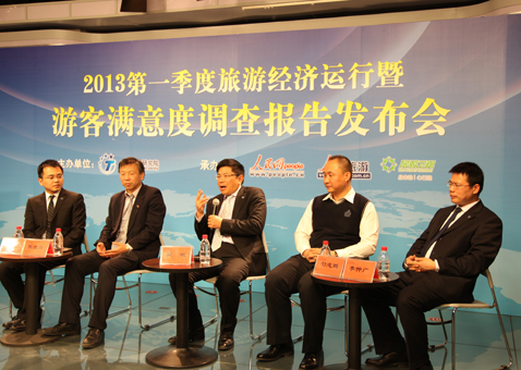 2013年4月9日由中国旅游研究院主办,人民网旅游频道、旅游卫视协办的2013年第一季度旅游经济运行暨游客满意度调查报告发布会在人民网演播室举行。中国旅游研究院院长戴斌教授、北京联合大学旅游学院副院长张凌云教授、去哪儿网公共事务部勾志鹏总经理、中国旅游研究院产业所所长李仲广副研究员等出席了发布会。来自人民日报、新华社、中央电视台、中国国际广播电台、人民日报海外版、中国旅游报、经济日报、中国旅游网、央视网、中国网等媒体机构代表也出席了发布会。
