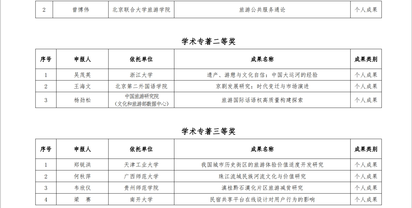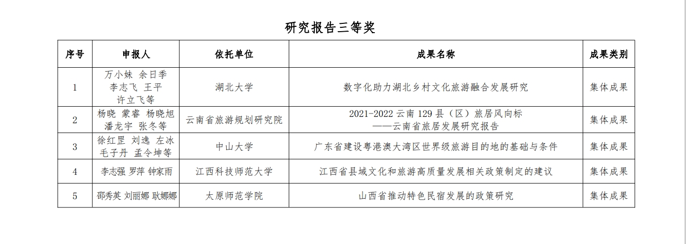 经报文化和旅游部,2023年度共30项成果被遴选为文化和旅游优秀研究成果。其中,学术论文10项,专著10项,研究报告10项。