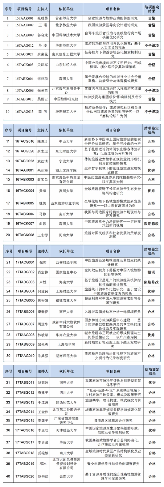 近日,文化和旅游部科研立项(旅游类)秘书处组织了2015年至2017年度原国家旅游局科研项目的结项评审工作。经鉴定,6项为优秀;28项通过结项;2项限期一年修改;3项不予结项;1项撤项。具体鉴定结果通知如下:
