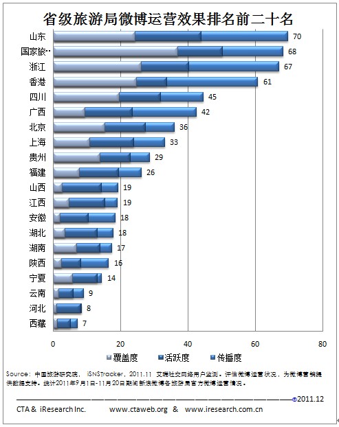 中国旅游研究院与艾瑞咨询共同提出微博运营效果评估模型,该模型由覆盖度、活跃度和传播力三大指标按权重综合计算得出。覆盖、活跃和传播之间存在递进关系,覆盖是基础,活跃度是传播的必要条件,有效传播是最终的目的。 我们通过这一评估体系对在新浪微博上开通微博的省级旅游局和市级旅游局进行排名,总结出微博运营效果前20位的省级旅游局和市级旅游局。