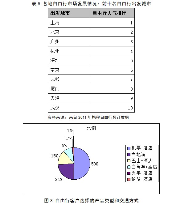 携程是国内自由行服务的发起者和领军者,从2004年以来开创和引领了旅行社自由行服务的发展,自由行产品和线路覆盖海内外200个旅游目的地,全国60多个出发城市,是国内领先的自由行服务商。从2011年携程自由行业务数据来看,国内自由行市场发展程度不同,上海、北京、广州三地以自由行方式休闲旅游的人数最多,杭州、深圳、南京、成都是第二梯队城市,厦门、武汉、天津、重庆、沈阳、青岛等属于第三梯队城市。从自由行休闲客户选择的产品类型和交通方式看,飞机自由行、巴士自由行、自驾车自由行三类产品是主流,火车高铁的自由行市场开发比较滞后。预订当地游服务的比例增长,比如票券、一日游、接送机、包车等。