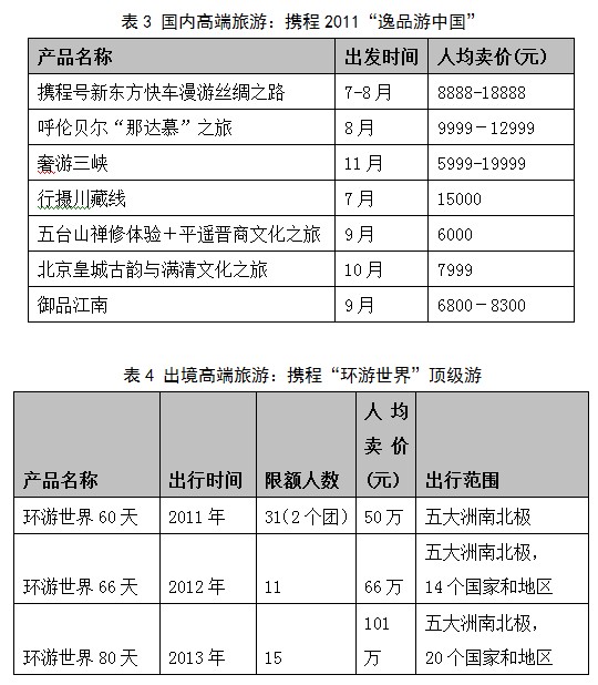 在满足大众旅游需求的同时,文化体验、科考探险、会议展览、邮轮游艇等有潜力的高端旅游产品能够推动中高收入阶层释放旅游消费潜能,促进消费。随着我国旅游市场的成熟,消费者能够享受的旅游服务越来越多,而以往只是小众的许多高端旅游方式已经广为人知,我国旅游已经逐渐与世界接轨。专门的高端旅游服务机构和品牌也开始出现,代表性的有携程推出的"逸品游中国"系列和"环游世界"顶级游系列。携程把高端旅游作为一个重要的业务,并与香港永安旅游、台湾易游网合作成立"鸿鹄逸游"品牌。