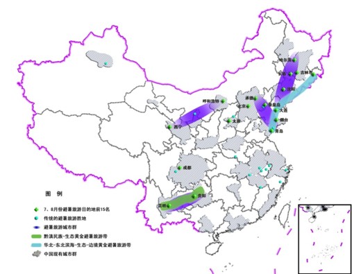 《报告》指出,避暑旅游是个潜力巨大的产业,完全有条件培育成为我国旅游业的"暑期档"。为此,我们要强化对优良舒适夏季气候资源战略性、稀缺性价值的认识,科学合理开发利用和保护避暑气候资源。及时总结地方经验,启动全国暑期旅游发展规划,引导避暑成为国民旅游消费的集中消费期。坚持以市场需求为导向,有意识地推出一批有品牌影响力的避暑旅游示范区、避暑旅游目的地城市及城市群,主要包括庐山、避暑山庄、北戴河等传统避暑胜地的优化与升级;在避暑气候资源富集的东北、西北及西南部分地区开发一批新兴的滨海、草原、山岳型避暑示范区;以及在重庆、长沙等火炉城市,京津、长三角、珠三角、渝中等大都市圈周边建设一批避暑示范区。重点扶持贵阳、哈尔滨、青岛、烟台等地建设避暑旅游目的地城市;依托东北、西北和西南、华北部分地区优良的避暑气候资源,加大基础设施和旅游公共服务体系建设,强化区域合作,打造以哈尔滨、沈阳、吉林、大连、长春等为主体的东北避暑旅游城市群;以秦皇岛、承德、青岛、烟台等为主体的华北避暑旅游城市群;以西宁、呼和浩特等为主体的西北避暑旅游城市群和以贵阳、昆明等为主体的西南避暑旅游城市群。规划好避暑旅游产品与线路,着力打造两条黄金避暑旅游带,即以贵阳、昆明两个城市为主要依托,以贵昆铁路、公路等为轴线,依托避暑气候,规划建设 "黔滇民族-生态黄金避暑旅游带";以青岛、烟台、大连、长白山为主要依托,以渤海沿岸、东北边境生态走廊为轴线,依托避暑气候,规划建设"华北-东北滨海-生态-边境黄金避暑旅游带"。(见下图)
