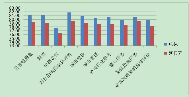 相比较而言,中国游客到访阿根廷还面临诸多客观条件和接待环境方面的约束。首先是路途遥远,没有直达航班,加上中转在内的30个小时的长途飞行对很多人的身体和心理都是巨大的考验。其次是签证获取上的困难,除了商务签证,普通中国人如果要来阿根廷旅游,需要提交的证明材料几乎可以写一份传记了。就是准备好了这些材料,也无法确切地获知什么时候可以拿到签证,甚至不确定是否可以拿到签证。还有就是目的地商业接待体系和服务水平,我所服务的中国旅游研究院按季度开展的《中国出国游客满意调查报告》表明,到访的中国游客评价,在22个样本目的地国家中排名也不是很高。在刚刚过去的2013年第三季度,到访阿根廷的中国游客满意度为77.80,在22个抽样国家中排名第17。全部样本国家的本季度平均水平为79.63,游客满意度最高的目的地加拿大为82.91。值得关注的是,受访游客对阿根廷旅游服务,特别是行业管理和景区景点服务的总体评价一般,对阿根廷旅游的抱怨比例为8%,投诉比例为5.3%,高于总体平均水平3.1个百分点。更为详细的调查研究报告,我的同事已经将英文版递交给了旅游部。为了让大家有一个直观的印象,我来展示一个到访阿根廷的中国游客满意度与同期出境游客满意度的对比图。